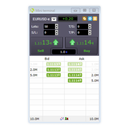 Le ofrecemos la posibilidad de ver la "Profundidad de mercado" para que conozca la liquidez subyacente para su volumen de operaciones. Puede ver la liquidez dispuesta en bandas de forma nativa en la plataforma MT5. El nivel de liquidez que satisface su volumen total de operaciones es la banda utilizada para ejecutar su operación.