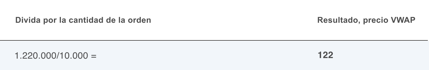 Esto significa que el precio de una orden que se presenta a profundidad se calculará como un “Precio Promedio Ponderado por Volumen” (o VWAP), utilizando precios de profundidad de mercado. Cada nivel que se utilice en el cálculo contribuirá al precio de la orden, ponderado por el número de unidades que se completen en cada nivel.