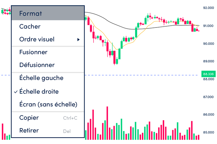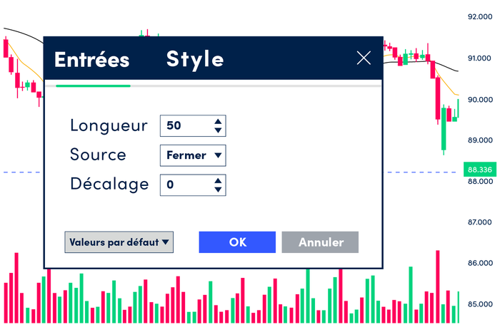 Vous pouvez le faire en sélectionnant EMA > Format. Vous pouvez également double-cliquer sur la ligne EMA de votre graphique. Une fenêtre s’ouvrira, vous permettant de personnaliser les paramètres. Sous «période », entrez la valeur du nombre de jours de la moyenne que vous souhaitez ajouter à votre graphique. Ainsi, si la première EMA est de 9, vous pouvez modifier la longueur des deux autres EMA à 50 et 200.