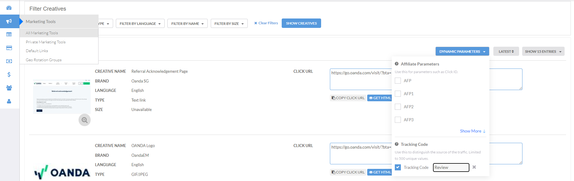 Your tracking link is a URL that is used by referrals when signing up to OANDA, so their trading activity can be linked to your account. When a referral completes the qualification criteria (this differs depending on region) you earn a commission.