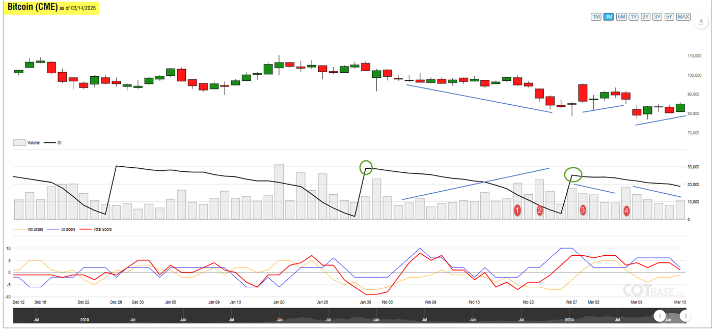 As displayed on the above chart, Bitcoin volume data released by the Commodity Futures Trading Commission (CFTC) for Bitcoin futures reflects a rising volume trend alongside a declining price and a declining volume trend with an increasing price. (marked by blue lines)