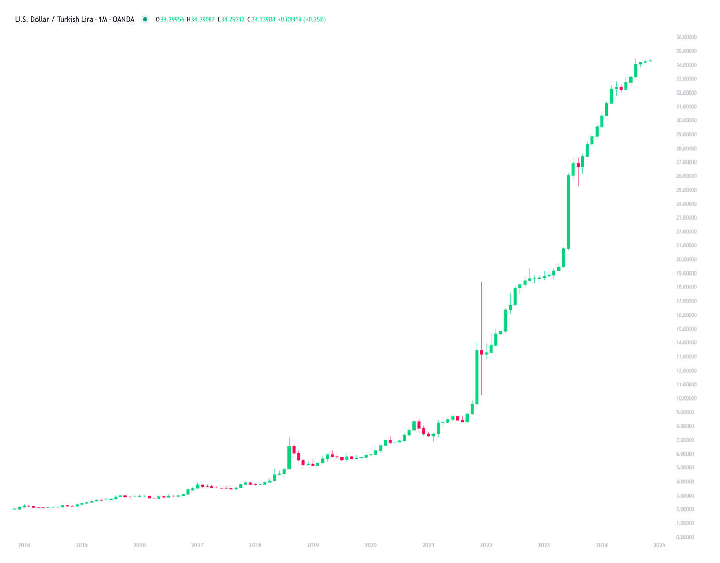 When looking at a chart of USD/TRY in the past few years, you’d be forgiven for thinking it was the price action of a previously unknown cryptocurrency, not the relationship between two fiat currencies.