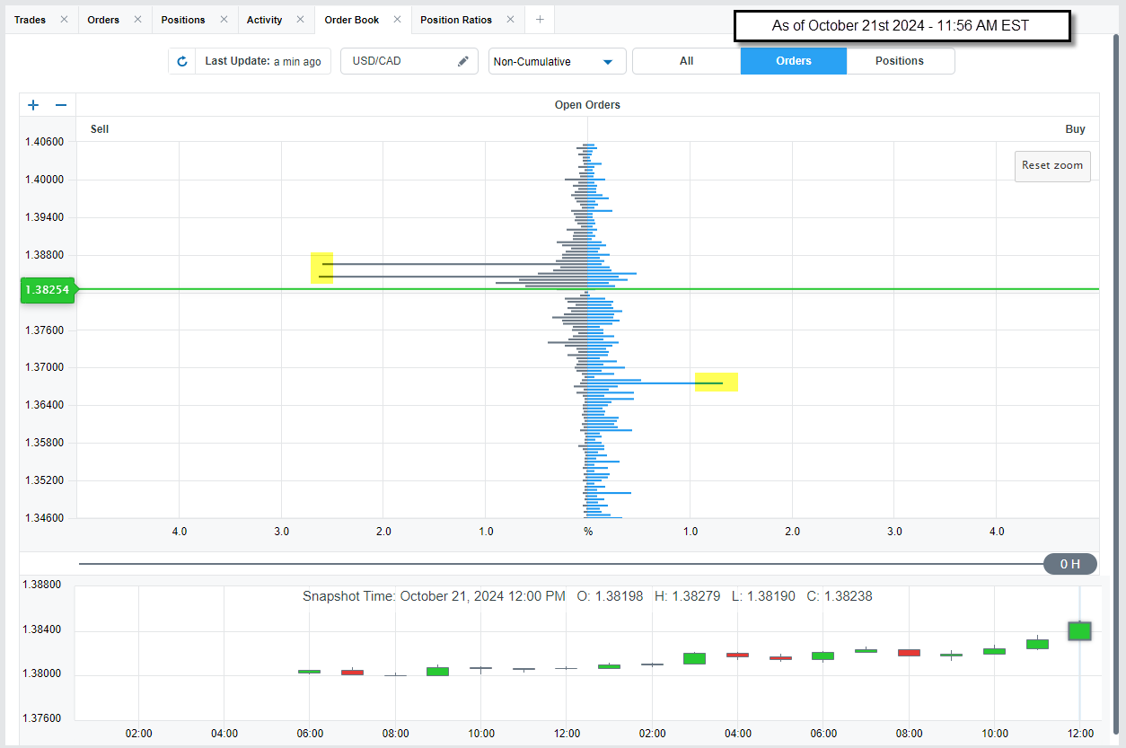 - A review of USD/CAD OANDA’s Order Book reflects clusters of buy orders near 1.3660 and clusters of sell orders near 1.3865 - 1.3845.